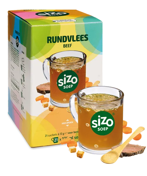 Wie houdt er niet van een rijke soep met de smaak van rundvlees, wortel en knapperige croutons? Maak van je pauze een moment van ontspanning en energie. Met Sizo soep geniet je niet alleen van de volle smaak, maar ook van 25% minder zout dan andere soepen op de markt. Eet smakelijk!